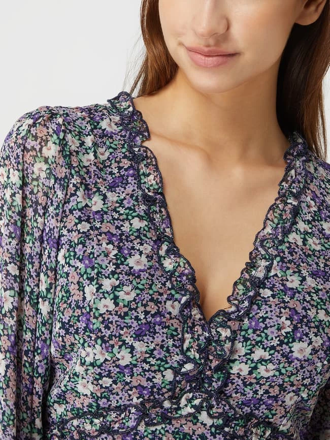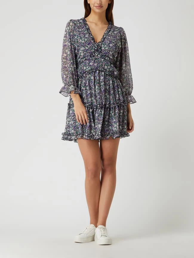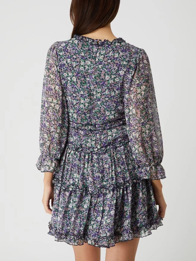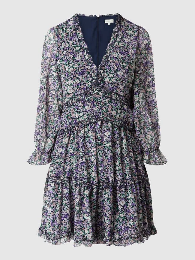 Das Kleid von Apricot ist aus Chiffon gefertigt und tailliert geschnitten. Es zeigt sich im Stufen-Look mit Millefleurs, Rüschen und verkürzten Trompetenärmeln.