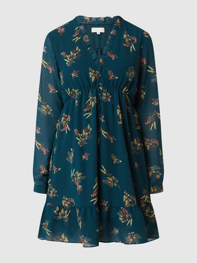 Das Kleid von Apricot ist aus Chiffon gefertigt. Es zeigt sich in taillierter Passform mit floralem Muster, Rüschen am Ausschnitt und Volantsaum.