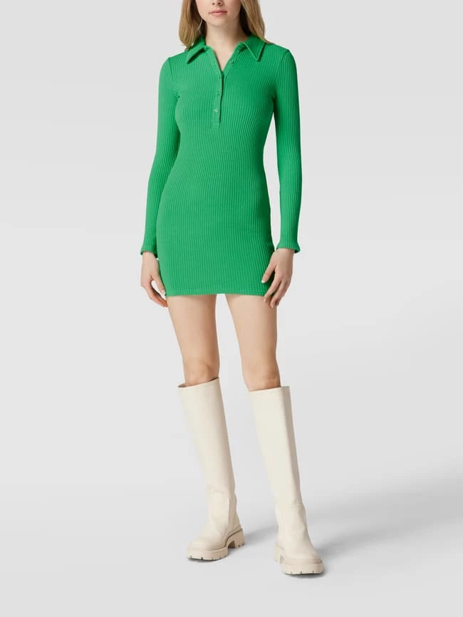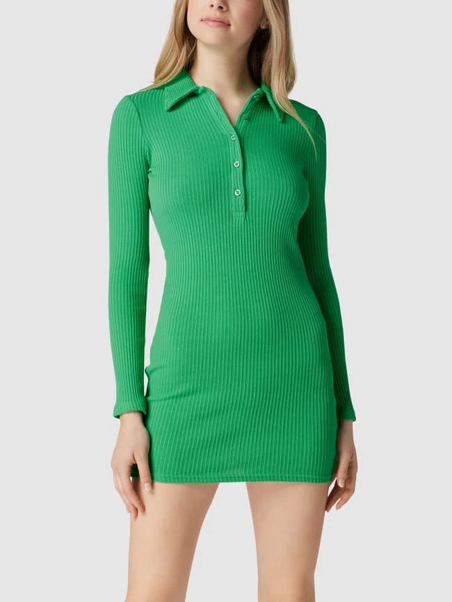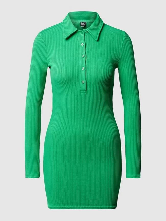 Das Minikleid von BDG ist aus einem Baumwoll-Elasthan-Mix gefertigt und eng anliegend geschnitten. Es kommt in Ripp-Optik mit Umlegekragen und kurzer Knopfleiste.