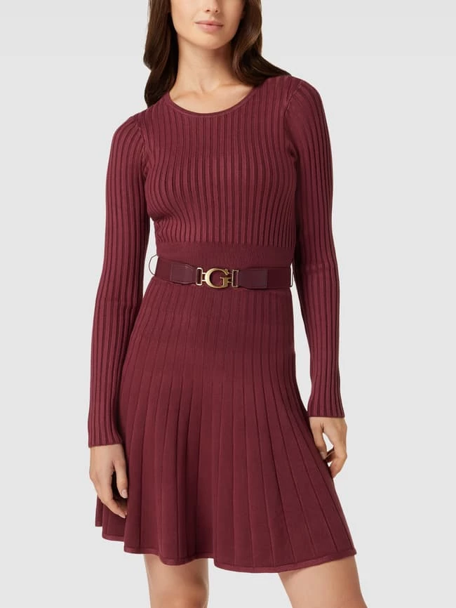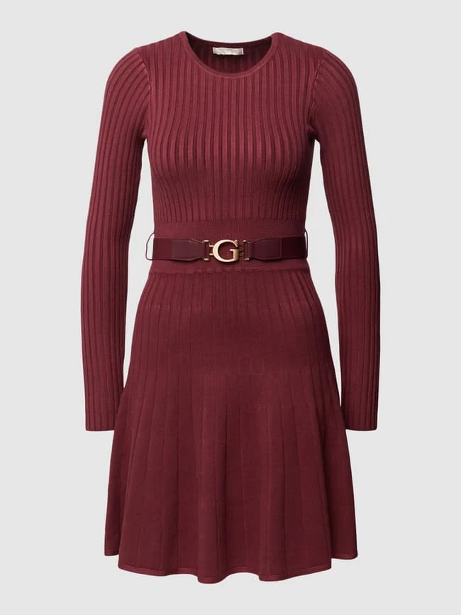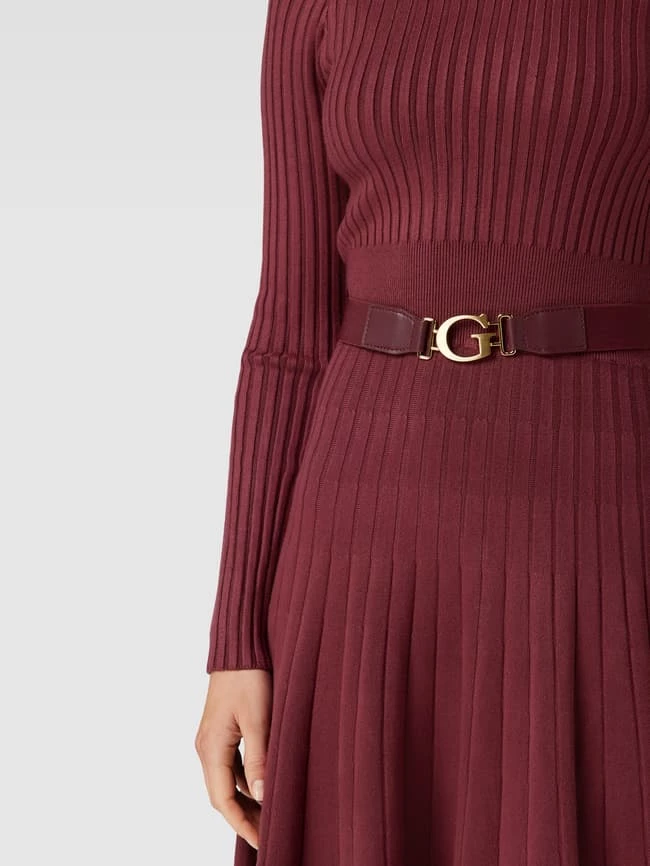 Das knielange Kleid von GUESS ist aus einem Viskose-Mix mit Stretch-Anteil gefertigt und im körpernahen Schnitt gehalten. Es zeigt sich in unifarbenem Design und Ripp-Optik sowie mit Taillengürtel.