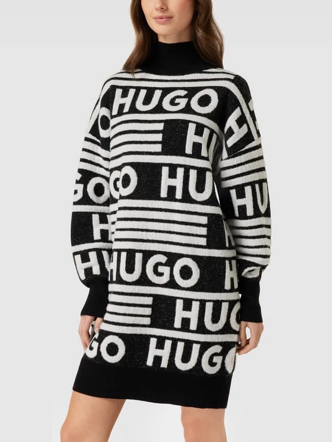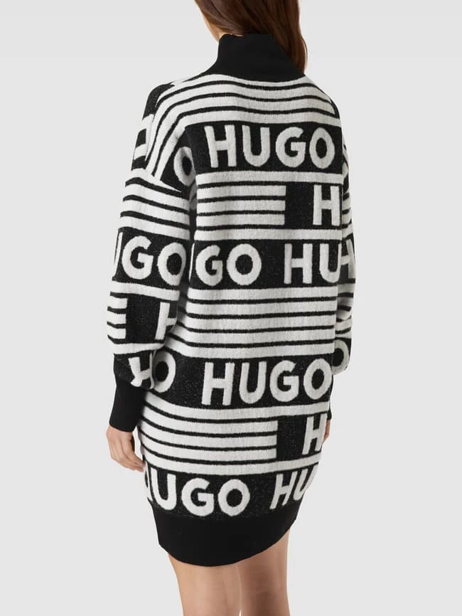 Das Minikleid von HUGO ist aus einem Material-Mix mit Woll-Anteil gefertigt und gerade geschnitten. Es zeigt sich mit Allover-Label-Muster und Rollkragen.