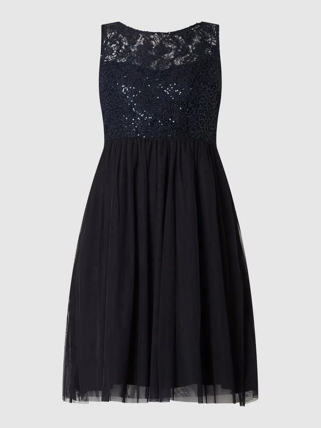 Das Cocktailkleid von Jake*s Cocktail ist aus Mesh gefertigt. Es zeigt sich in taillierter Passform mit floralen Zierborten, Pailletten und tiefem Rückenausschnitt.