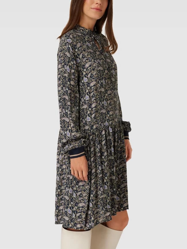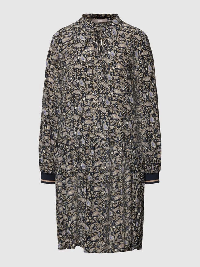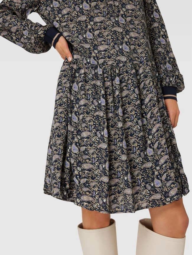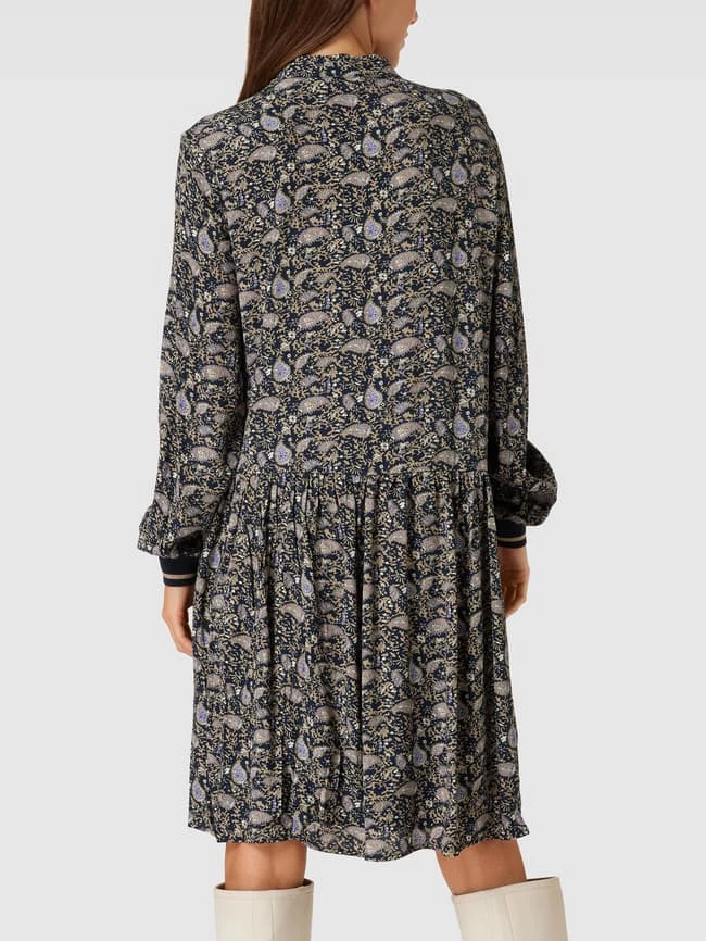Das knielange Kleid von Jake*s Collection ist aus reiner Viskose gefertigt und im lockeren Schnitt gehalten. Es zeigt sich mit Paisley-Muster, Schlüsselloch-Ausschnitt und gerippten Ärmelabschlüssen.