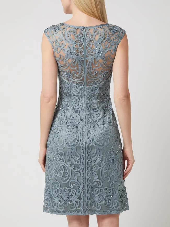 Das Cocktailkleid von LUXUAR LIMITED ist aus Tüll gefertigt und eng anliegend geschnitten. Es zeigt sich mit Zierborten, Strasssteinen und Nahtreißverschluss auf der Rückseite.