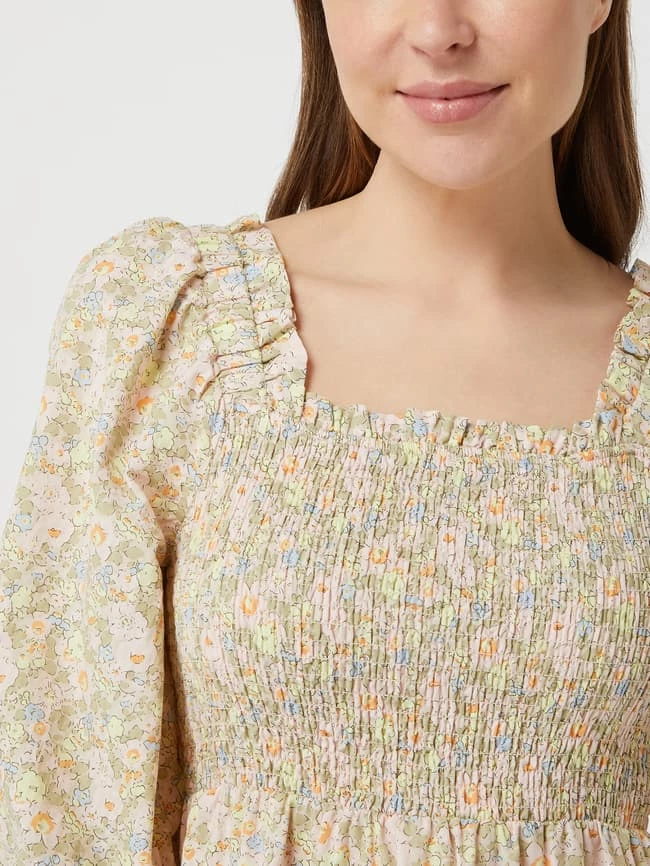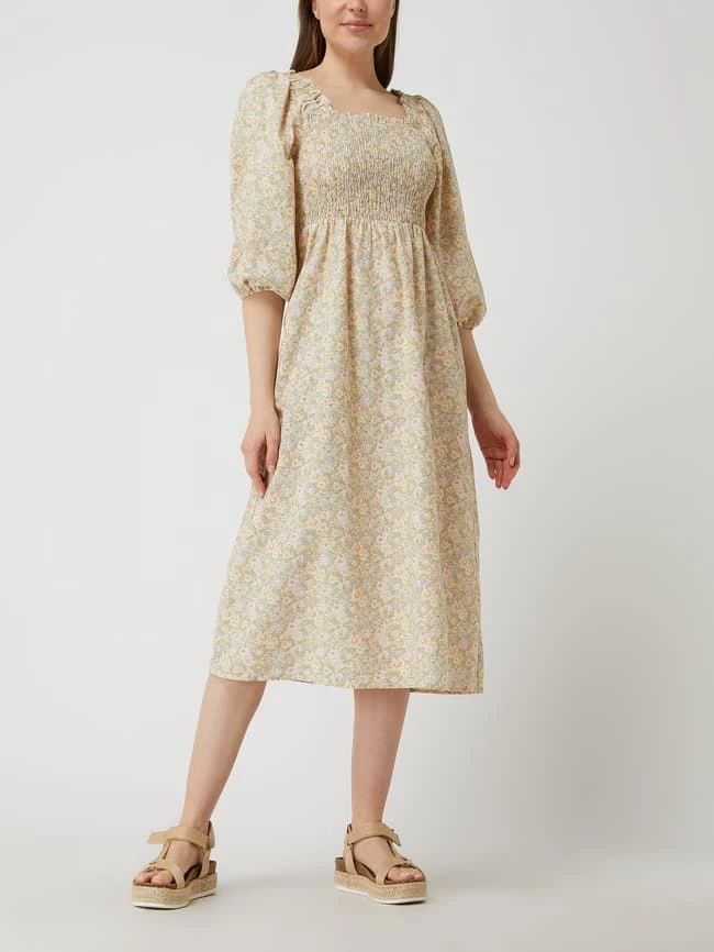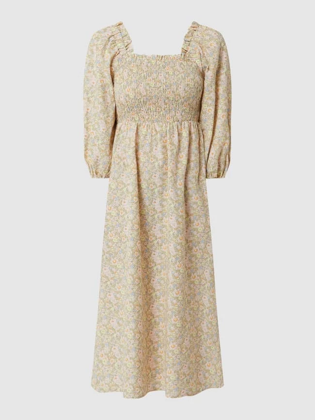 Das Midikleid von Modström ist aus einem Baumwoll-Viskose-Mix gefertigt und tailliert geschnitten. Es kommt mit Millefleurs, gerüschtem Karree-Ausschnitt und 3/4-Arm.
