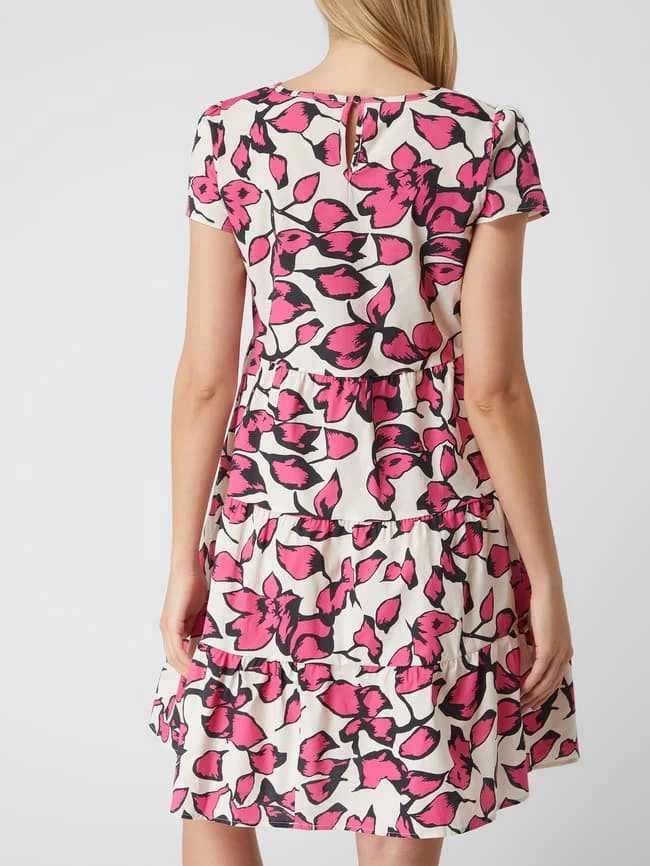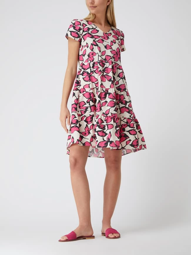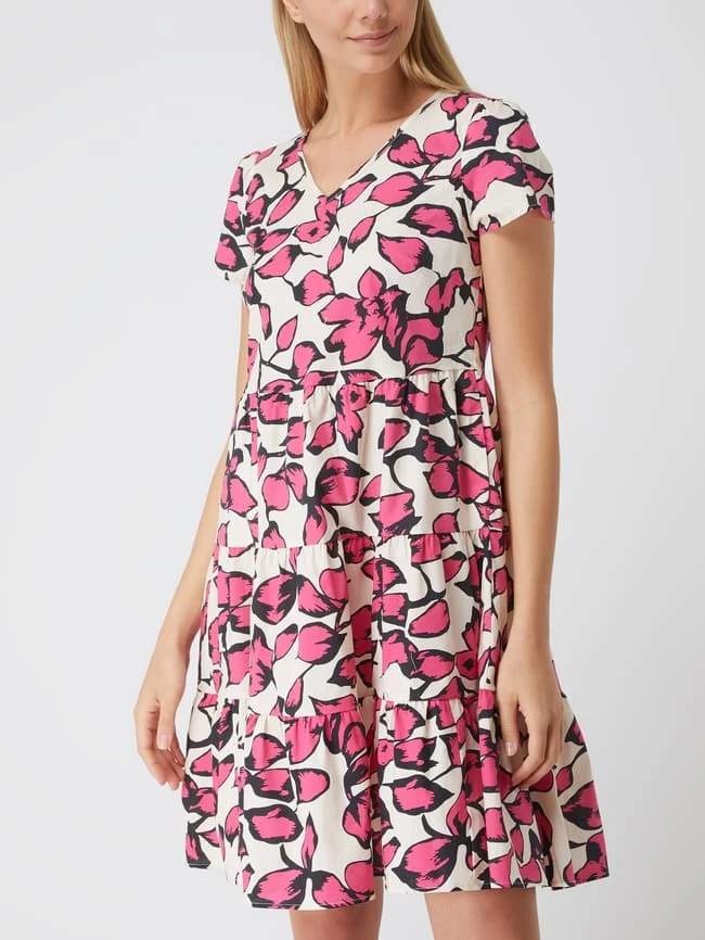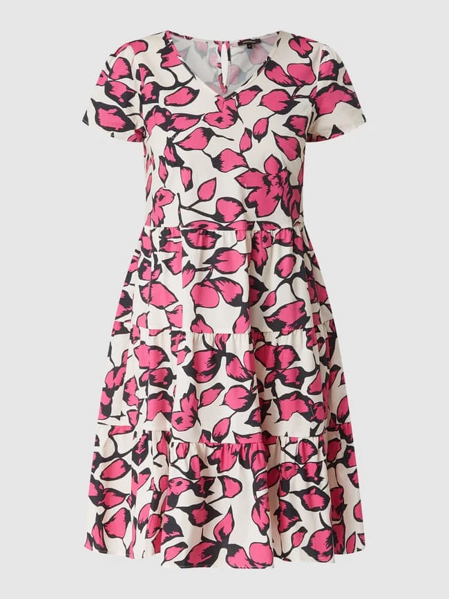 Das Kleid von MORE & MORE ist aus einem Baumwoll-Elasthan-Mix gefertigt. Es zeigt sich in ausgestellter Passform und im Stufen-Look mit V-Ausschnitt.