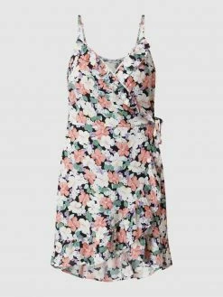 Das Minikleid von ONLY ist aus einer Materialmischung mit recyceltem Polyester gefertigt. Es zeigt sich in A-Linie mit V-Ausschnitt, Volants und Raffungen.