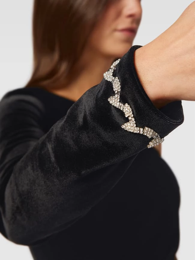 Das Abendkleid von Paradi ist aus einem elastischen Material-Mix gefertigt und körpernah geschnitten. Es zeigt sich aus Samt mit One-Shoulder-Träger und Zierbesatz aus Strasssteinen.