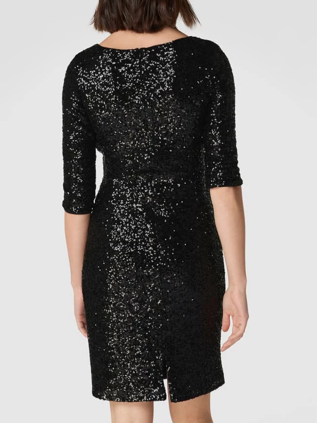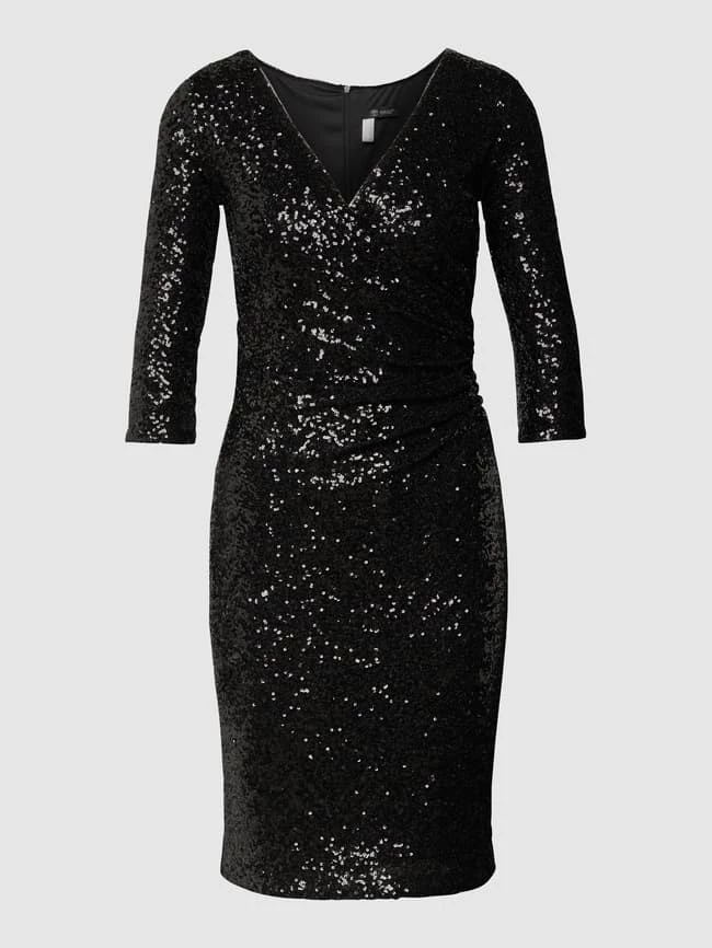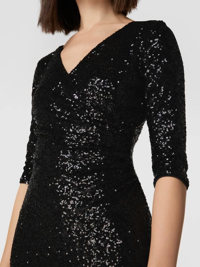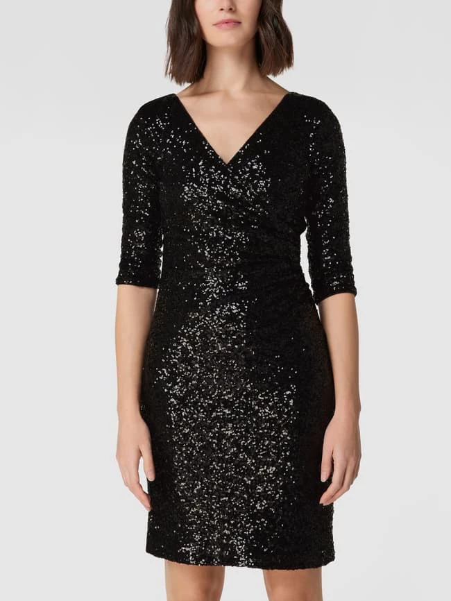 Das Cocktailkleid von Paradi ist aus einem elastischen Material-Mix gefertigt und eng anliegend geschnitten. Es kommt in Wickel-Optik mit Paillettenbesatz und V-Ausschnitt sowie 3/4-Arm.