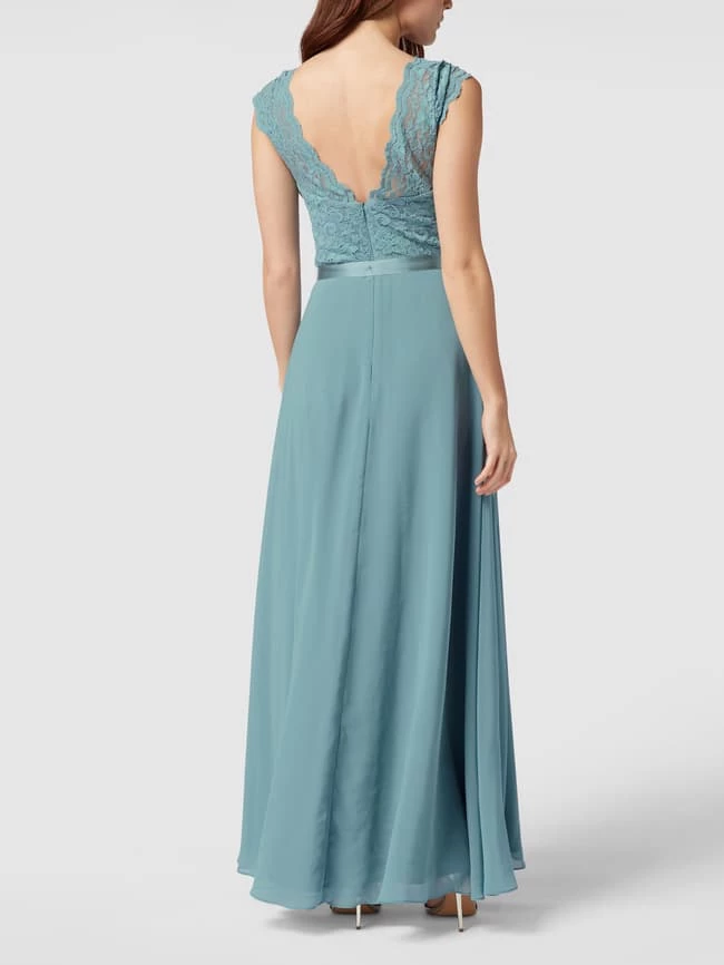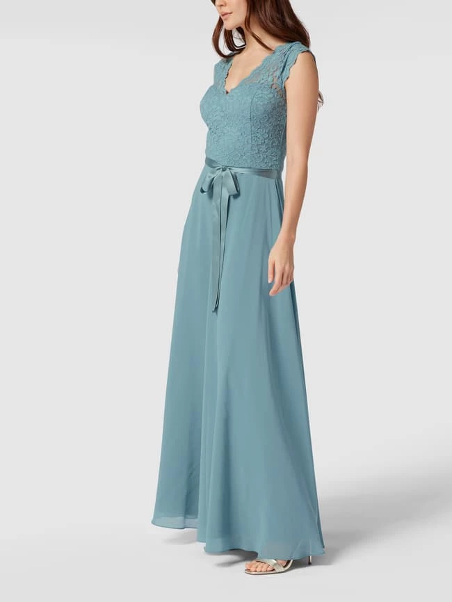 Das Abendkleid von SWING ist aus strapazierfähigem Material gefertigt und tailliert geschnitten. Es kommt mit kurzen Ärmeln, Oberteil mit floralen Stickereien, Taillengürtel sowie abgesetztem Rockteil.